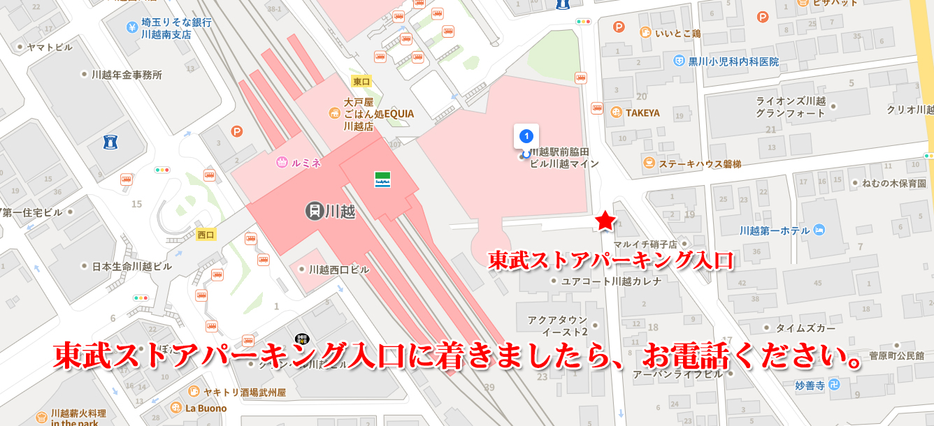 | アクセス | 川越駅東口より徒歩2分 東武ストアパーキング入口に着きましたら、お電話ください。 |